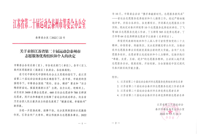 近日,江苏省第二十届运动会泰州市筹备委员会办公室发布了《关于表彰江苏省第二十届运动会泰州市志愿服务优秀组织和个人的决定》,我校荣获“江苏省第二十届运动会泰州市志愿服务优秀组织单位”,我校5位带队教师获得“江苏省第二十届运动会泰州市志愿服务先进工作者”,64位志愿者荣获“江苏省第二十届运动会泰州市优秀志愿者”。