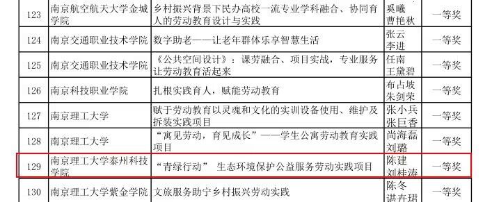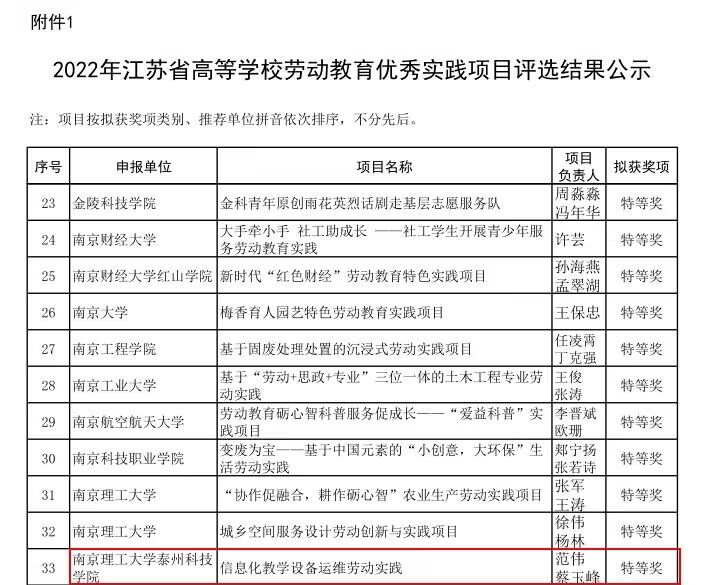 近日,2022年江苏省高等学校劳动教育优秀实践项目评选结果公示,我校申报的《信息化教学设备运维劳动实践》、《“青绿行动”生态环境保护公益服务劳动实践项目》等2个项目分别获得特等奖和一等奖。