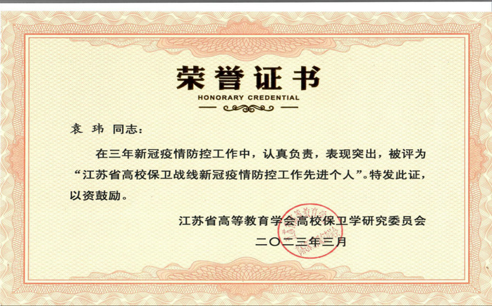 近日,在江苏省高教学会保卫研究会第十届二次理事会暨2022年学术年会活动中,我校后勤保卫处袁玮、秦海金同志被江苏省高等教育学会高校保卫学研究委员会评为“江苏省高校保卫战线新冠疫情防控工作先进个人”。