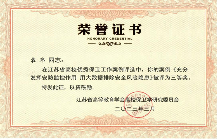 近日,在江苏省高教学会保卫研究会第十届二次理事会暨2022年学术年会活动中,我校教职工袁玮同志的案例《充分发挥安防监控作用 用大数据排除安全风险隐患》被江苏省高等教育学会高校保卫学研究委员会评为江苏省高校优秀保卫案例三等奖。此次通过个人申报、学校推荐、专家评选、公示等环节,全省共评选出优秀案例16个。泰州7所高校仅我校1人获奖。