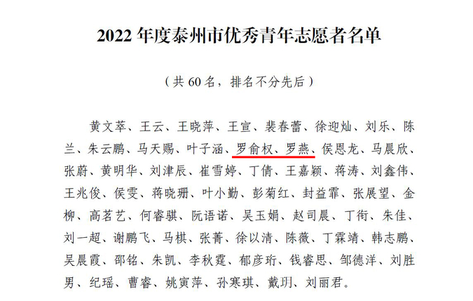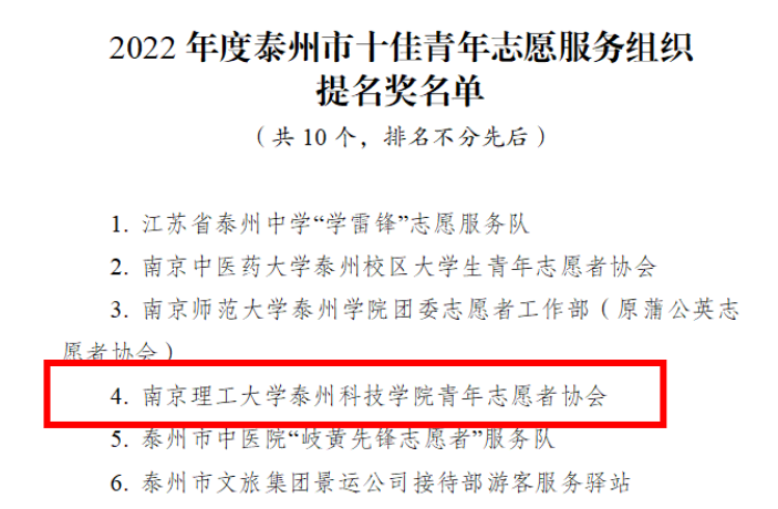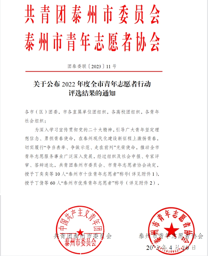 近日,共青团泰州市委、市青年志愿者协会公布了2022年度全市青年志愿者行动评选结果,我校罗俞权、罗燕2名同学获得“泰州市优秀志愿者”称号,我校青年志愿者协会获得了“泰州市十佳青年志愿服务组织提名奖”。