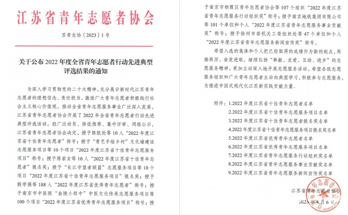 喜报:我校在2022年度江苏省青年志愿者行动中获得多项荣誉