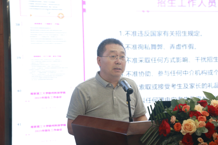 会上,学生工作处(部)副处(部)长薛建华对2023年高考政策以及招生工作形势进行了梳理和分析,并围绕招生计划、招生政策、招生宣传等三个方面对学校招生工作具体安排进行了说明。