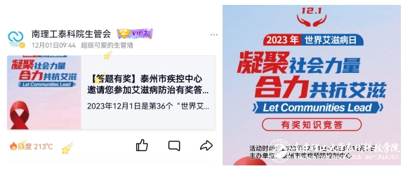 12月1日,我校通过校学生生活管理委员会官方QQ推送,积极开展线上宣传,转发市疾控中心相关微信,号召广大师生参与有奖知识竞答,充分利用平台宣传艾滋病相关知识点。