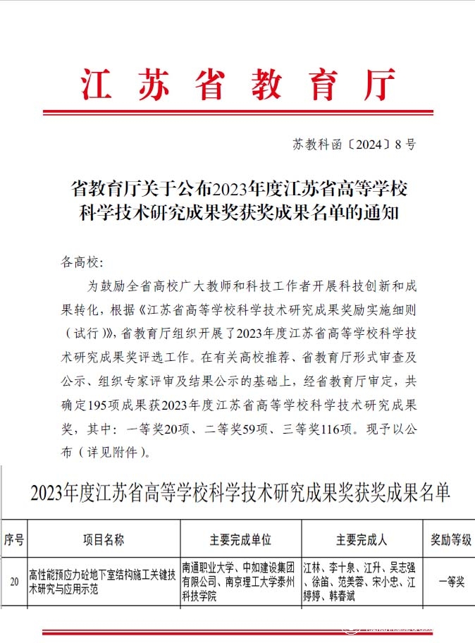 近日,省教育厅公布2023年度江苏省高等学校科学技术研究成果奖获奖成果名单。我校教师李十泉为第二完成人的成果《高性能预应力砼地下室结构施工关键技术研究与应用示范》获得江苏省高等学校科学技术研究成果一等奖。据悉,2023年度江苏省高等学校科学技术研究成果奖共195项,其中,一等奖20项、二等奖59项、三等奖116项;我校是唯一获得一等奖的独立学院。
