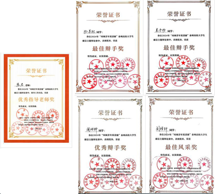 最终,我校辩论队获得此次泰州高校大学生廉洁主题辩论赛亚军,我校获得本次比赛“优秀组织奖”,马研部张君副教授获得“优秀指导老师奖”,22审计班孙苏秋、22英语班吴予扬获“最佳辩手奖”,22环境班闻皓轩获“优秀辩手奖”和“最佳风采奖”。