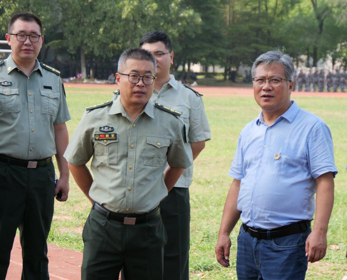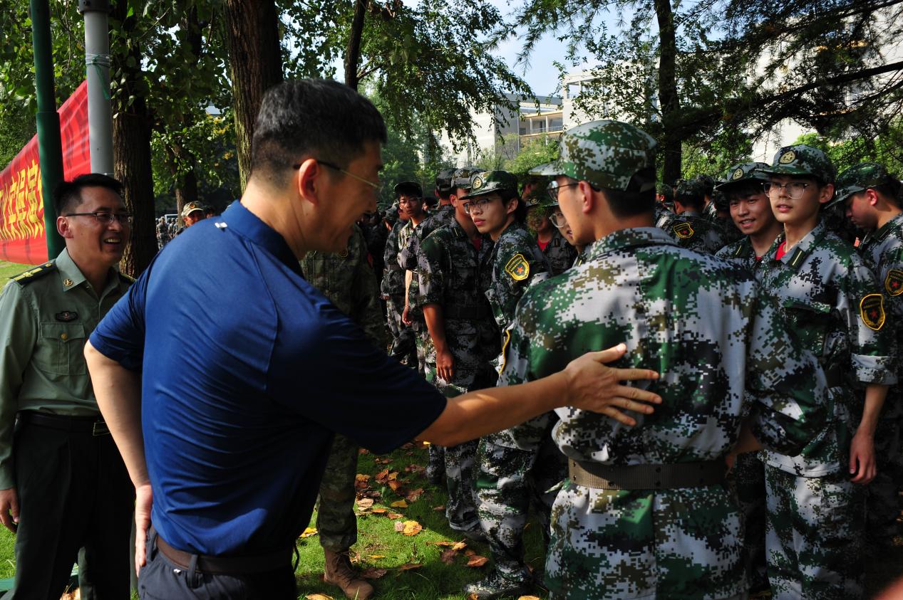 9月14日,正值中秋佳节来临之际,上午9点,院长杨森,党委书记孙元鹏,军训团团长、党委委员、教务处处长鞠晨鸣,军训团政委、党委委员、学生工作处处长高朝鲜,以及学工处相关同志等一行人来到学生军训训练场,慰问全体承训教官、参训师生,致以节日的问候。
