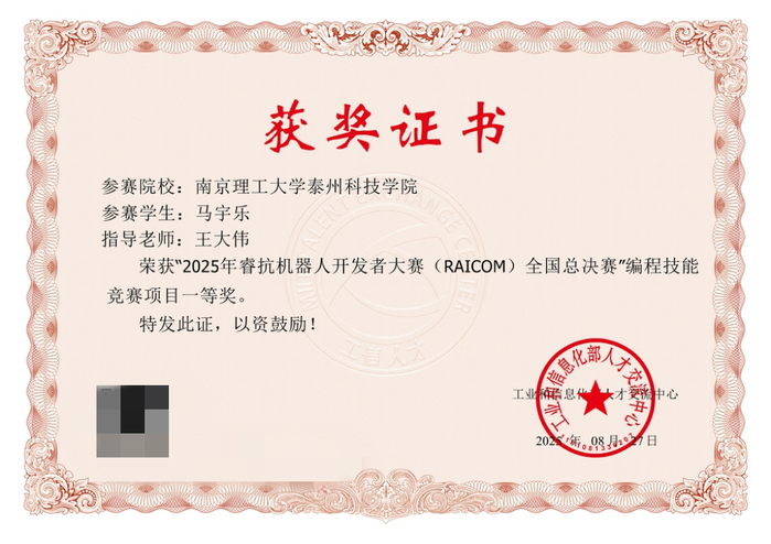近日,2025年睿抗机器人开发者大赛(RAICOM)-编程设计CAIP赛道全国总决赛结果揭晓。我校计算机科学与工程学院王大伟、姜枫、曹红根、高广银四位教师组成的指导老师团队,指导学生在比赛中共获得江苏省一等奖1项、二等奖7项、三等奖16项;共获得全国一等奖2项、二等奖2项、三等奖3项。其中22软件(嵌)马宇乐、23软件2班祁凯宇两位同学荣获全国总决赛一等奖。
