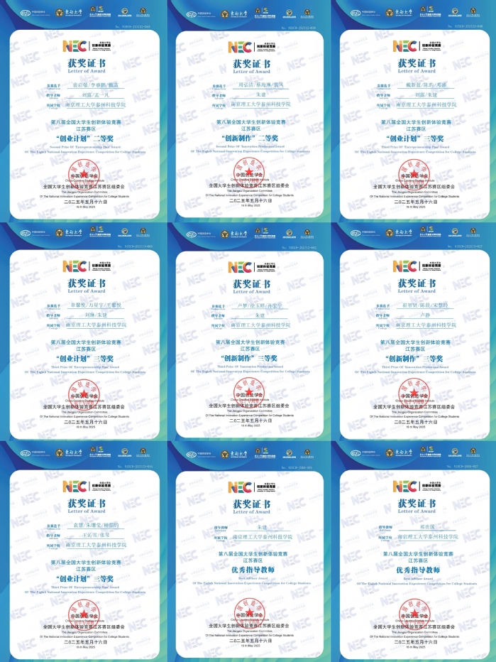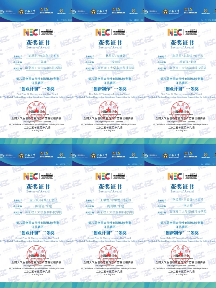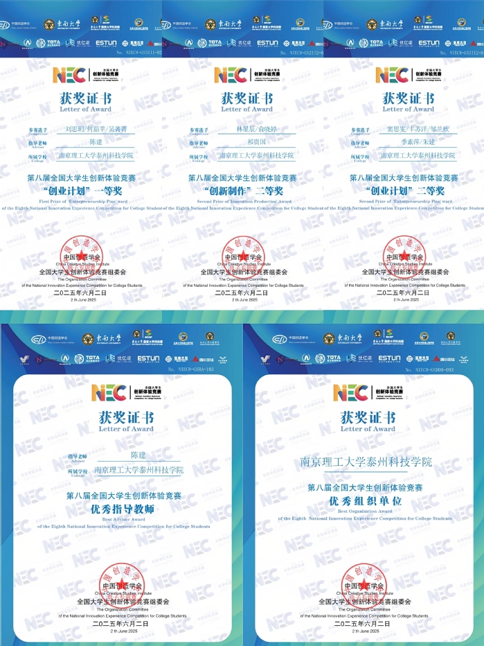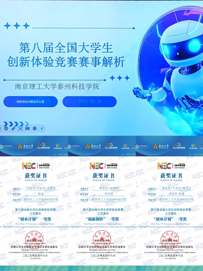 我校自2025年1月启动“创新杯”备赛工作以来,创就办组织多场专题培训打磨参赛材料,开展全真模拟路演答辩,遴选推送20组优秀作品参加省赛,最终荣获江苏赛区一等奖3项、二等奖5项、三等奖7项。祁贵国和朱建获评“优秀指导老师”,学校获评“优秀组织单位”。
