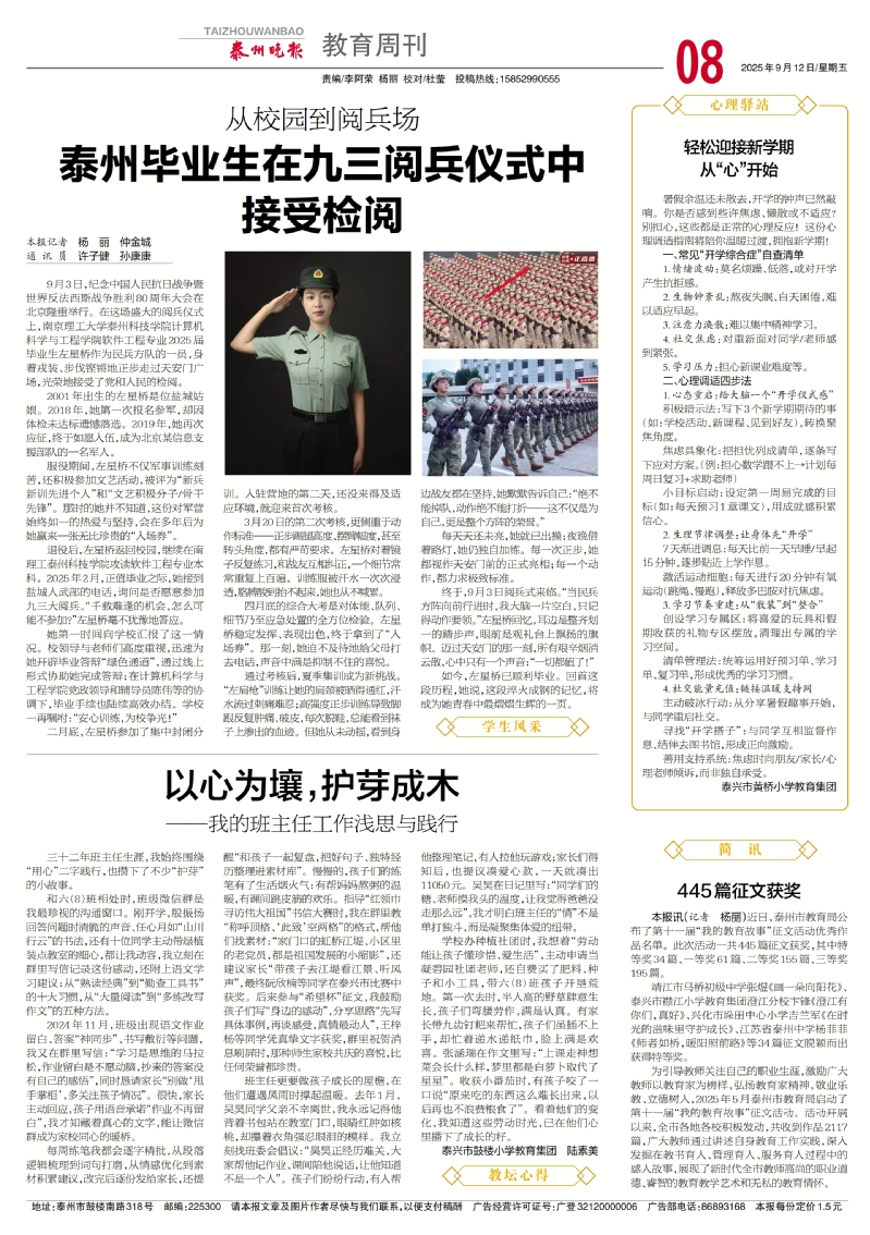 首页 校园信息 媒体关注 泰州晚报 | 从校园到阅兵场 泰州毕业生在九三阅兵仪式中接受检阅 发表时间:2025-09-12 浏览量:306 信息来源:泰州晚报 作者:杨丽 仲金铖 编辑:孙康康 审核人:许子健 回到顶部 分享: