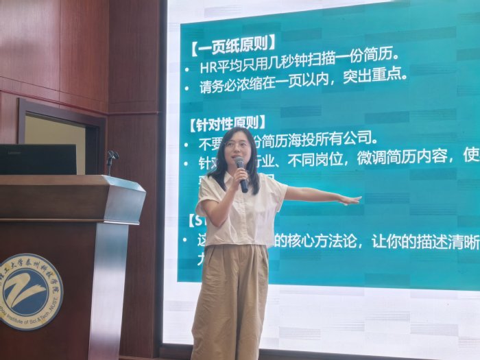 随后,新东方泰州学校招聘经理佴蕾围绕简历制作、面试技巧、核心竞争力等方面展开系统讲解。详细讲解了一页纸原则、针对性原则及STAR原则,指导同学们如何清晰、有说服力地展现个人经历与能力。在面试技巧环节,她提醒同学们提前研究企业与岗位,准备结构化自我介绍,并运用STAR原则梳理个人故事库,做到有备而来、自信表达。鼓励同学们以积极心态面对求职挑战,通过真实经历展现自身潜力。