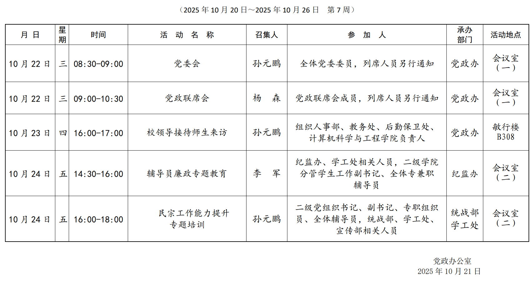 学校第七周主要会议安排