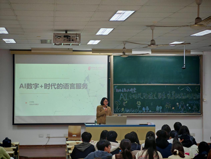 座谈会后,洪细梅总监在2403教室为外国语学院师生带来了题为《AI数字+时代的语言服务:变革、机遇与职业突围》的专题讲座。讲座紧扣生成式人工智能(GenAI)重塑语言服务业态的时代背景,内容详实、视野前沿。洪老师从“语言服务行业与人工智能漫谈”切入,结合翻译行业总产值等具体数据,分析了行业向高附加值解决方案转型的趋势,并详解了AI工具在翻译辅助、内容创作等场景的具体应用。她强调,大语言模型已推动行业从“人工翻译”向“人机协同”跃迁,鼓励同学们“主动探索,让AI为我所用”。紧接着,她聚焦“英语专业学生考研与就业路在何方”,清晰指出了“语言+教育/跨境电商/出版”等六大黄金赛道,为同学们提供了多元化的职业发展视角。在“语言服务行业对人才的要求”部分,她明确了译员需具备“会翻译、用工具、能编辑”的核心能力,并强调了跨文化交际与持续学习的重要性。针对同学们普遍关注的“AI是否将取代译者”等问题,洪老师给出了明确而积极的回应:“AI负责速度与规模,人负责质量与深度,人机协作才是未来方向。”在互动环节,她与同事们还就工具学习、实习机会等实际问题进行了细致解答,现场同学纷纷表示:“讲座既有宏观的趋势指引,又有微观的方法指导,受益匪浅!”