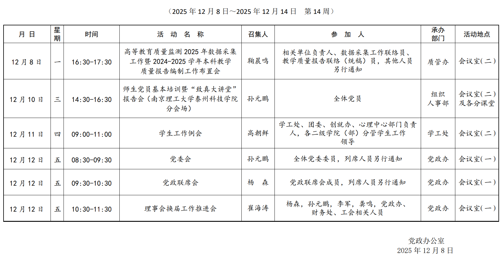学校第十四周主要会议安排