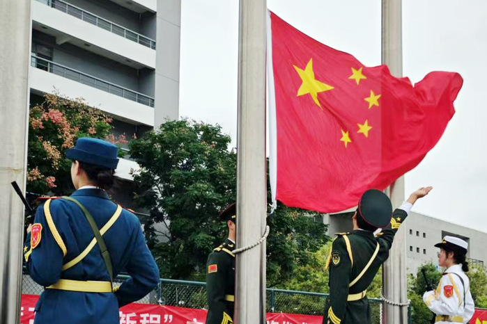 伴随雄壮激昂的《义勇军进行曲》,鲜艳的五星红旗缓缓升起。师生们肃立注目,齐声高唱国歌,铿锵有力的旋律饱含赤诚,浓浓的爱国情在校园中激荡。