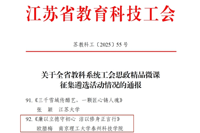 近日,江苏省教育科技工会公布2025年全省教科系统工会思政精品微课征集遴选结果,我校马克思主义理论教学研究部欧腊梅老师主讲的微课《廉以立德守初心洁以修身正言行》荣获思政精品微课。