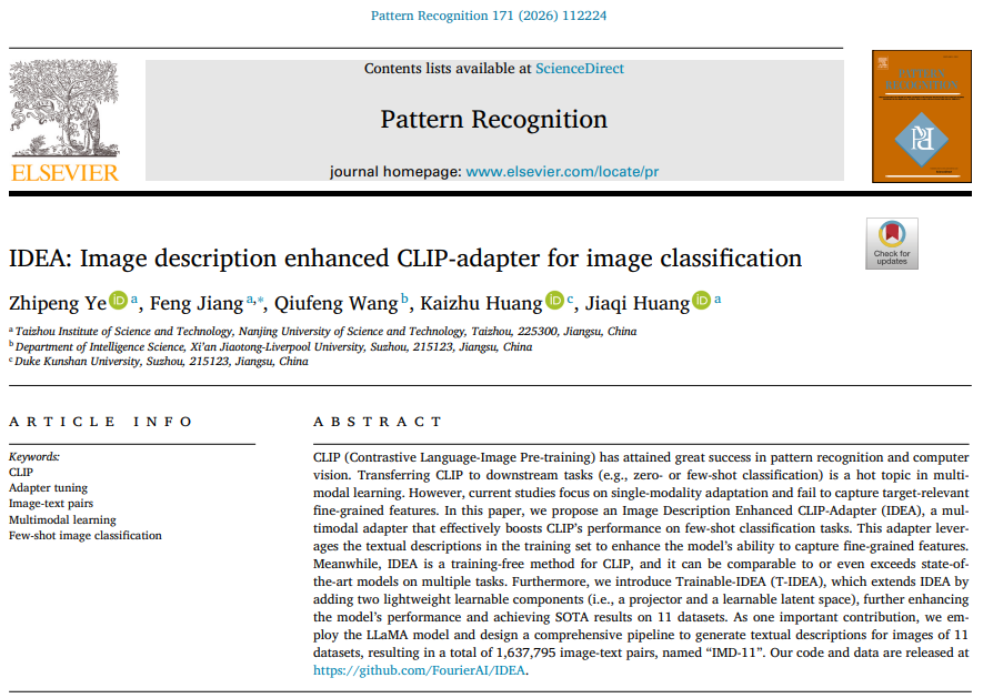 2025年,我校获批省部级、市厅级课题61项,申报获批率76% ,较上一年度提高15%,授权发明专利增幅40%,多项科技工作者建议获泰州市领导批示,获批泰州市大数据与人工智能重点实验室,为赋能地方数字经济产业升级筑牢科研支撑平台;全校教师发表高水平论文数量较上年提升60%,其中,姜枫教授领衔的研究团队在少样本图像分类前沿领域取得突破,团队骨干教师叶志鹏作为第一作者完成的论文《IDEA: Image description enhanced CLIP-adapter for image classification》,发表于人工智能与模式识别领域顶级期刊《Pattern Recognition》,顾磊磊博士作为共同作者完成的论文《Dynamic Nanodomains Dictate Macroscopic Properties in Lead Halide Perovskites》发表在《Nature Nanotechnology》(IF=35.1),标志着我校在相关学科领域的研究水平取得新进步。