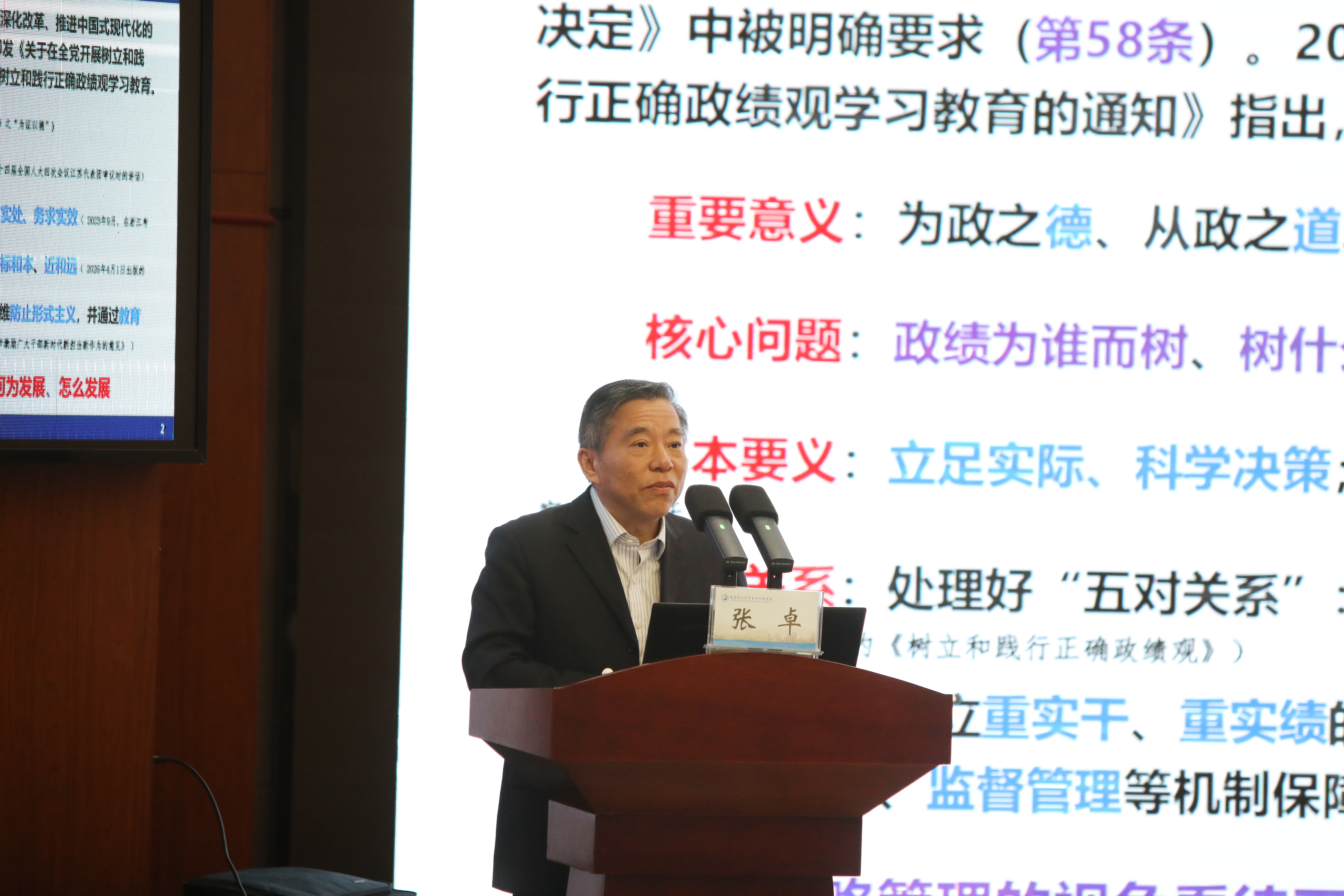 报告会上,张卓教授以《创建一流应用型大学的战略思考和行动——基于正确政绩观的视角》为题,紧扣正确政绩观核心要义,围绕“为何发展、何为发展、怎么发展”三大问题,从战略管理维度深刻阐释了正确政绩观与高校战略发展的内在关联,明确其对应用型高校谋长远、促发展的重要意义。立足新时代高等教育发展大势与地方应用型本科建设实际,他从战略时代成长逻辑、大学战略运行体系构建、战略思维与重点行动领域三个层面,系统解读了应用型高校高质量发展的战略逻辑、体系框架与实践路径。报告政治站位高、理论阐释深、实践指导性强,为科学谋划学校发展蓝图,以正确政绩观引领高水平应用型大学建设提供了战略指引与行动遵循。